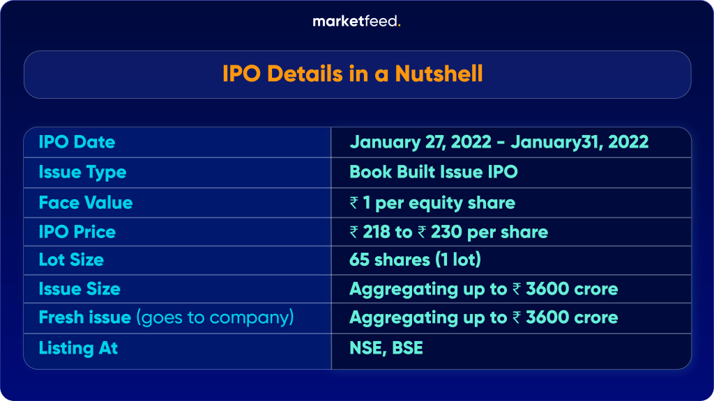 The IPO includes a fresh issue of about 15.65 crore shares, aggregating to Rs 3,600 crore. Individual investors can bid for a minimum of 65 equity shares (1 lot) and in multiples of 65 shares thereafter. You will need a minimum of Rs 14,950 (at the cut-off price) to apply for this IPO. The maximum number of shares that can be applied by a retail investor is 845 equity shares (13 lots).