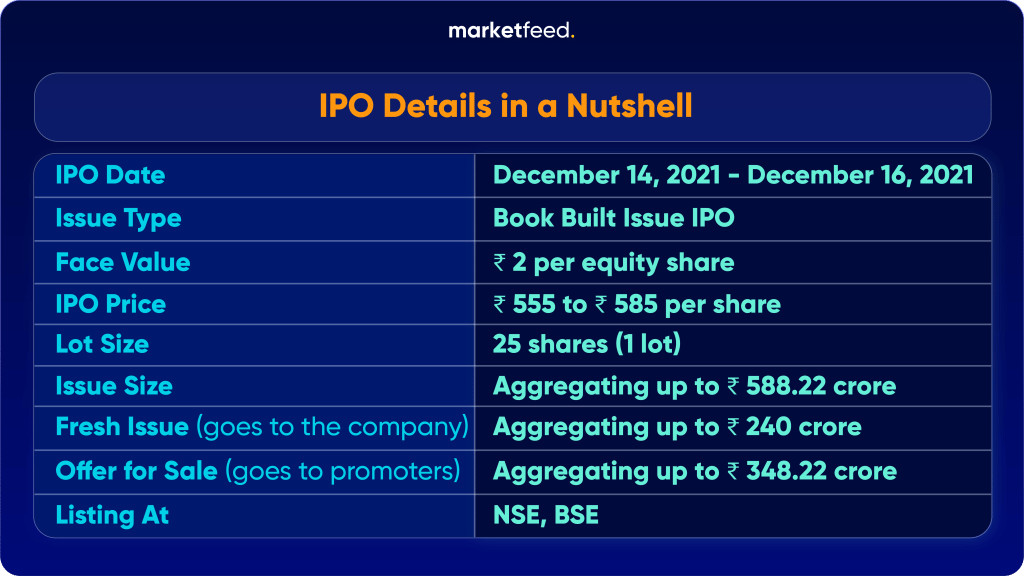 The fresh issue of shares (of the face value of Rs 2 each) aggregates to Rs 348.22 crore. The IPO also includes an offer for sale (OFS) by promoters and early investors, aggregating to Rs 240 crore. Individual investors can bid for a minimum of 25 equity shares (1 lot) and in multiples of 25 shares thereafter. You will need a minimum of Rs 14,625 (at the cut-off price) to apply for this IPO. The maximum number of shares that can be applied by a retail investor is 325 equity shares (13 lots).