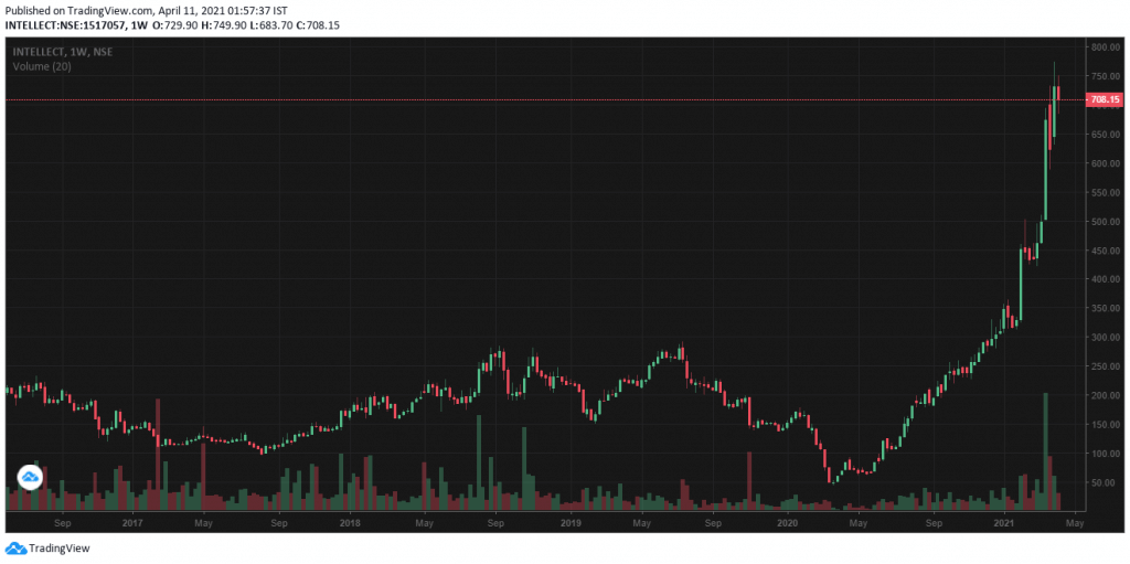 Before the Covid pandemic, the stock used to take a massive resistance around Rs 300. A not-so-great financial performance in FY20 was received negatively by the investors and the stock fell. In March 2020, just like many other stocks, Intellect Design also touched its all-time low of Rs 43.80. On 1st April 2021, it touched its all-time high of Rs 773.80. That means in just over a year time frame, it has given whopping returns of more than 1500%! How great is that?!
