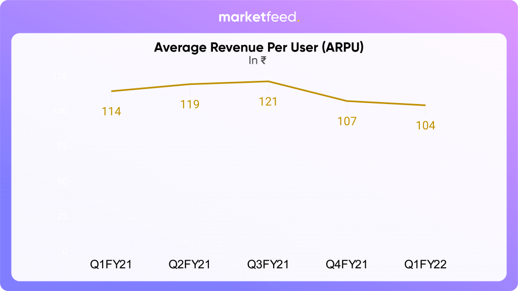 - The Average Revenue Per User (ARPU) declined to Rs 104 in Q1 FY22, compared to Rs 107 in Q4 FY21. For comparison, Bharti Airtel had an ARPU of Rs 146, whereas Jio had an ARPU of Rs 138 in Q1.
