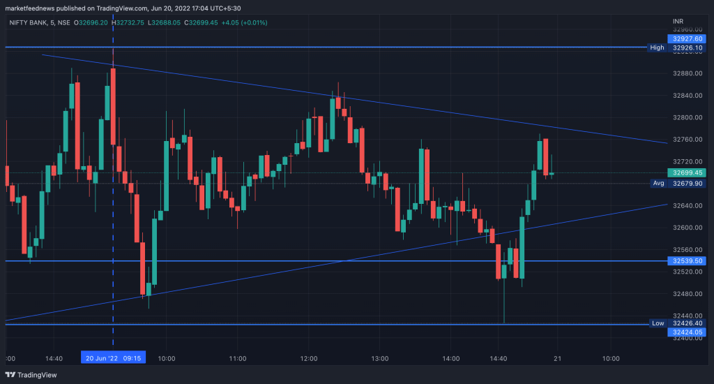 BANK NIFTY started the day with a slight gap-up at 32,873. Yesterday’s support at 32,480 was taken and the index bounced back twice. Bank Nifty ended the day at 32,684, down by 58 points or 0.18%.