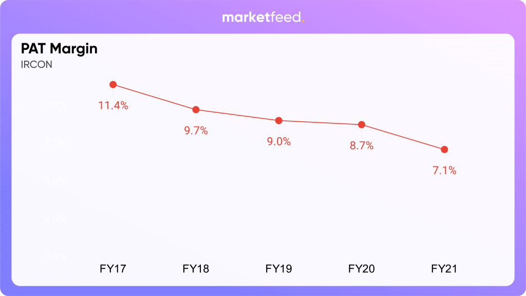 IRCON’s profit after tax (PAT) margin has been declining and was recorded at 7.1% in FY21. The company’s revenue has been increasing over the years, but profits have not grown at the same pace.