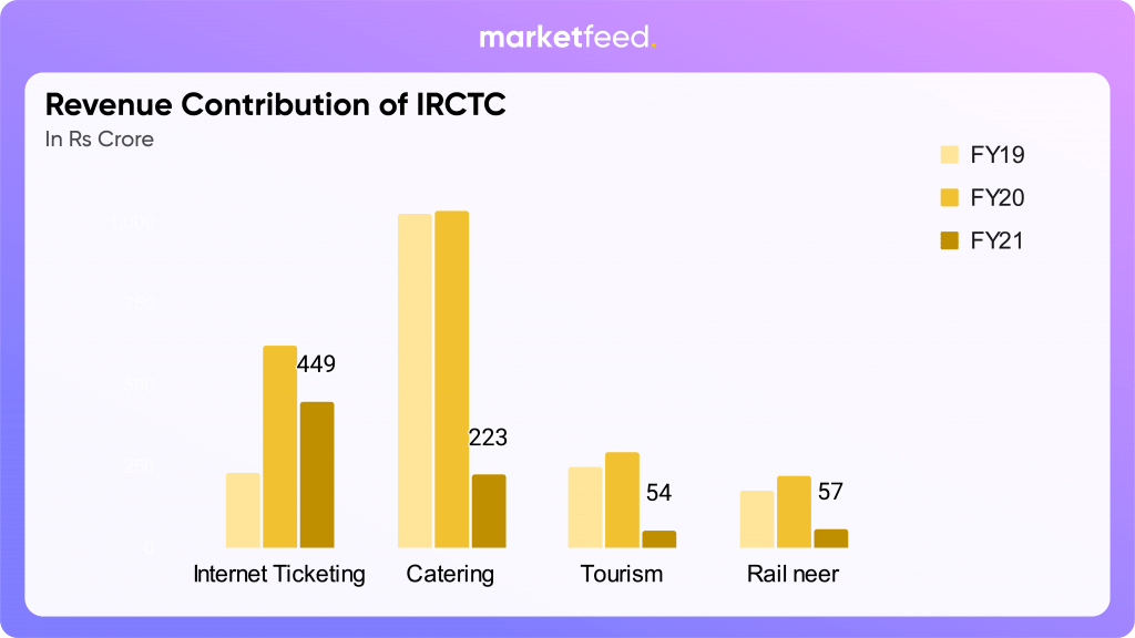 IRCTC’s Internet Ticketing service has the highest profit margin. From 69% in FY19, it has increased to 78% in FY21. It means that for every Rs 100 the company earns as revenue through this segment, they are able to keep Rs 78 as profit. This makes it one of the most profitable businesses in the industry.