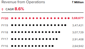 Tech Mahindra is one of those very few companies which has always seen its top-line growing over the years. At the end of FY20, the company reported revenue from operations to be Rs 36,868 crore. This was up by 6% to what was recorded in FY19. The chart below shows the revenue from operation trend in the last five years. The CAGR for the same stands at 8.6%.