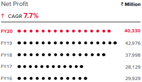 The bottom line for the company saw a slight decline in FY20 for the first time in four years. Tech Mahindra recorded profits worth Rs 4,033 crore in FY20 against Rs 4,298 registered in FY19. This was mainly because of a slight increase in the cost of services and higher depreciation. Depreciation amount can go up and down each year so a company should not be judged on that basis alone. The CAGR for the net profit stands at 7.7% as shown by the chart below. Like most companies, Tech M is also net-debt free which allows it to invest more in upcoming technologies and better staff.