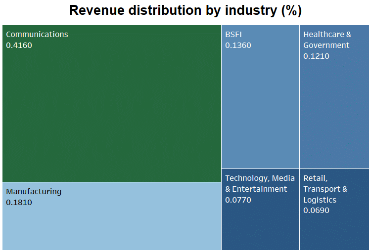 In today's era, every business in any industry requires a robust IT support to make a mark. Thus, it is no surprise to see Tech Mahindra offer services to a number of industries. The chart below shows the percentage of revenue they collect from each industry. The highest contributor to their top line comes from the communications sector.